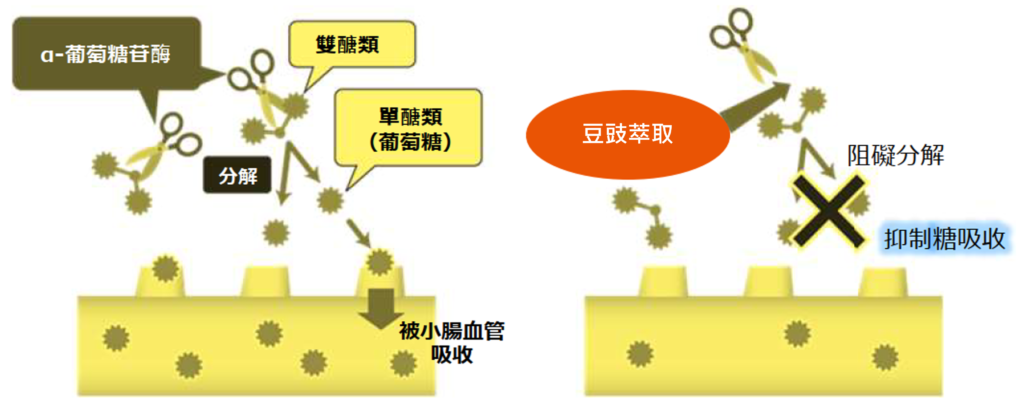 豆豉萃取可阻礙α–葡萄糖苷酶作用,抑制雙醣類分解成單醣,降低體內對葡萄糖的吸收,減緩血糖上升。